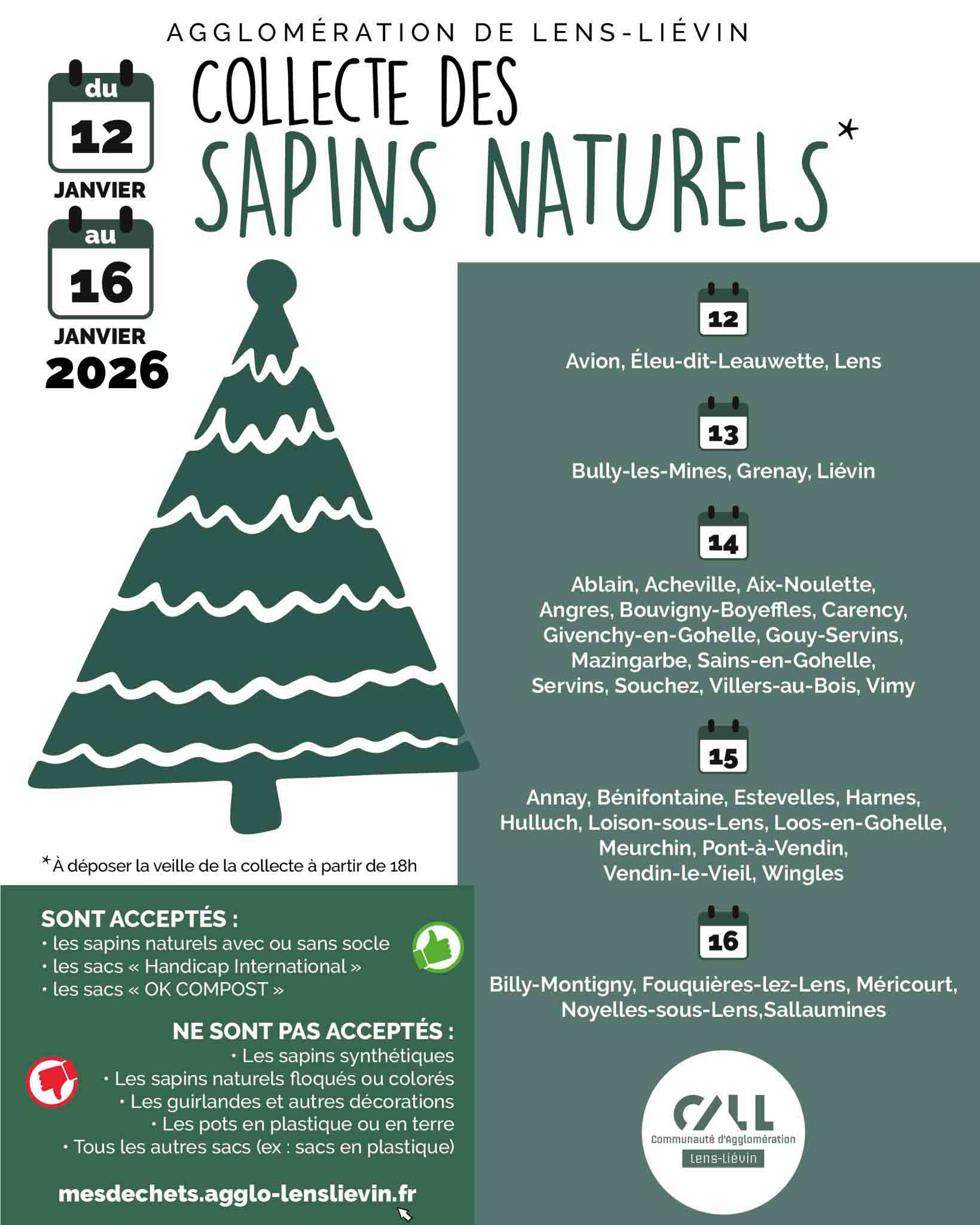 À Hulluch, la collecte des sapins naturels en porte-à-porte aura lieu le jeudi 15 janvier. Merci de sortir vos sapins naturels, la veille de la collecte, à partir de 18h. Sapins naturels acceptés (avec ou sans socle, sacs “Handicap International” ou “OK COMPOST”). Pas de sapins synthétiques, floqués, décorés ou en pot.