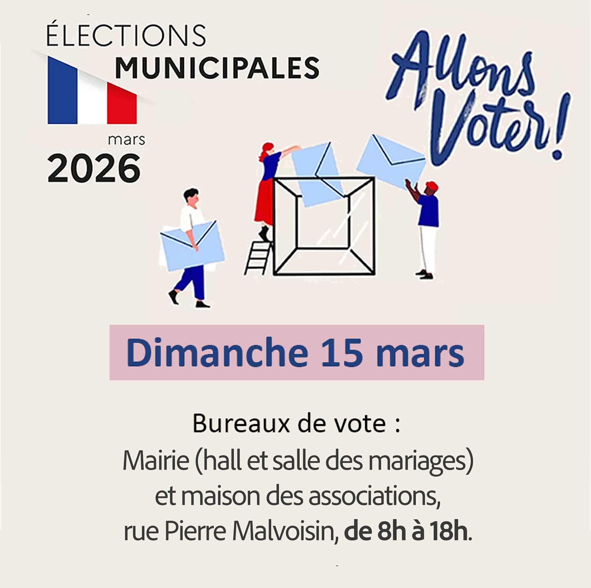 Ce dimanche 15 mars, les bureaux de vote (hall de la mairie, salle des mariages et maison des associations) seront ouverts de 8h à 18h.